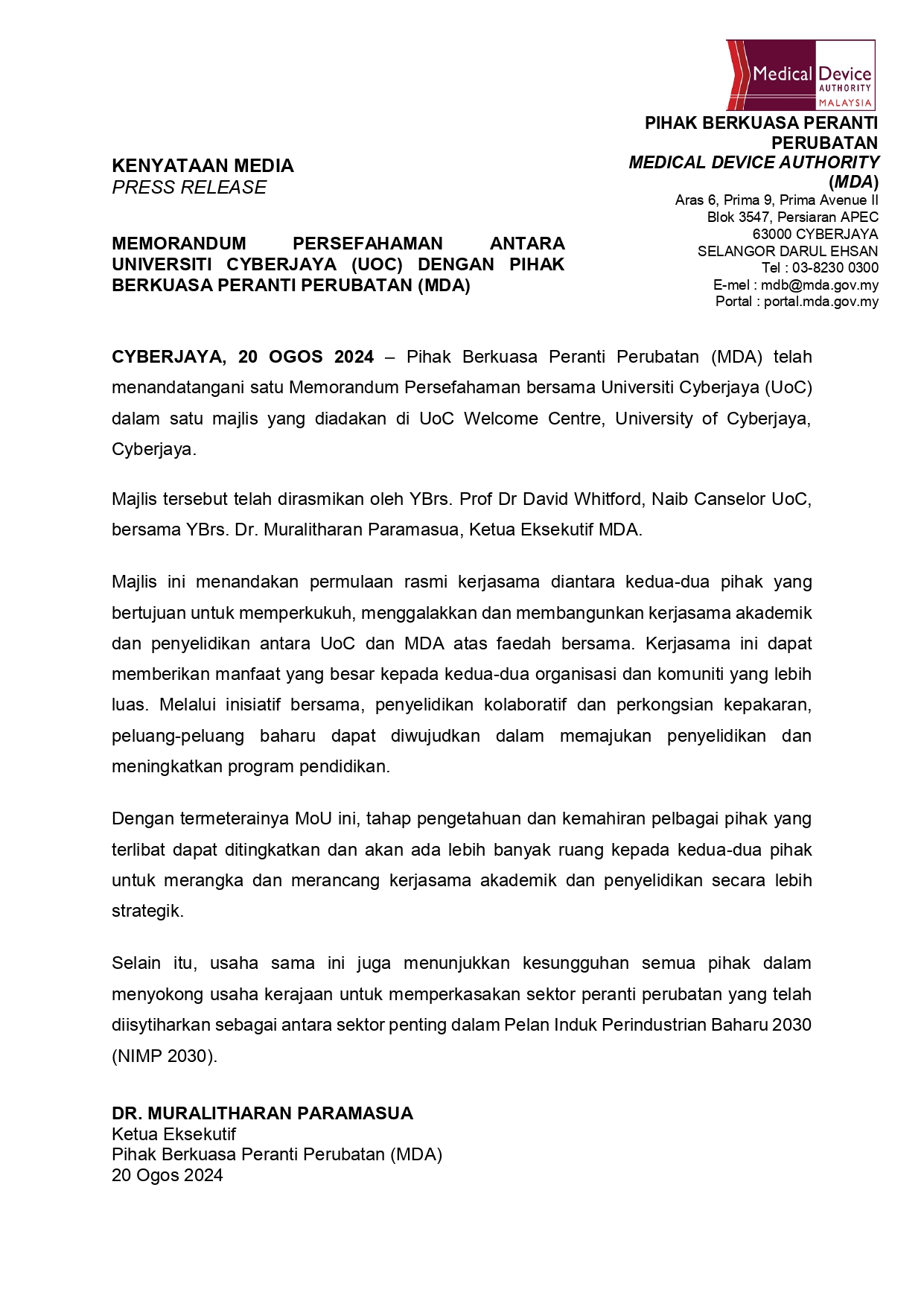 3. KENYATAAN MEDIA: MEMORANDUM PERSEFAHAMAN ANTARA UNIVERSITI CYBERJAYA (UOC) DENGAN PIHAK BERKUASA PERANTI PERUBATAN (MDA)