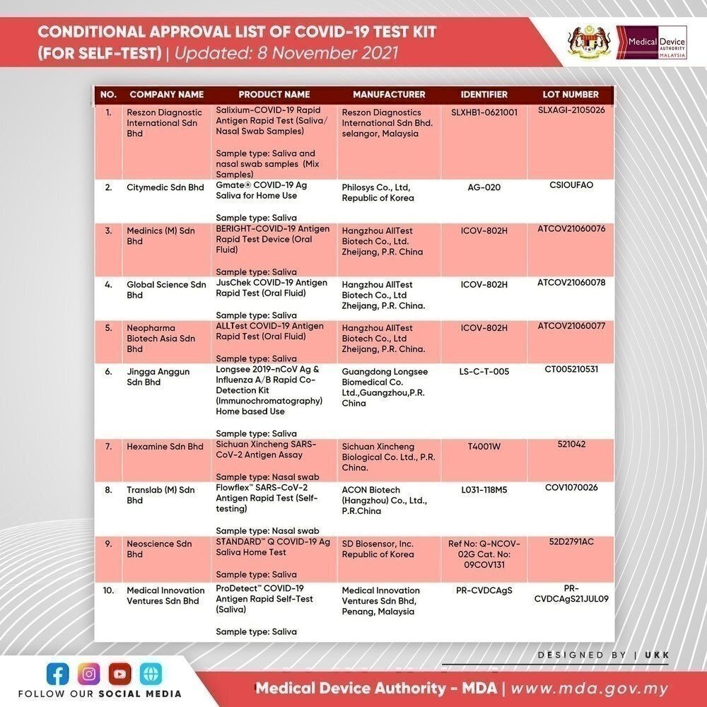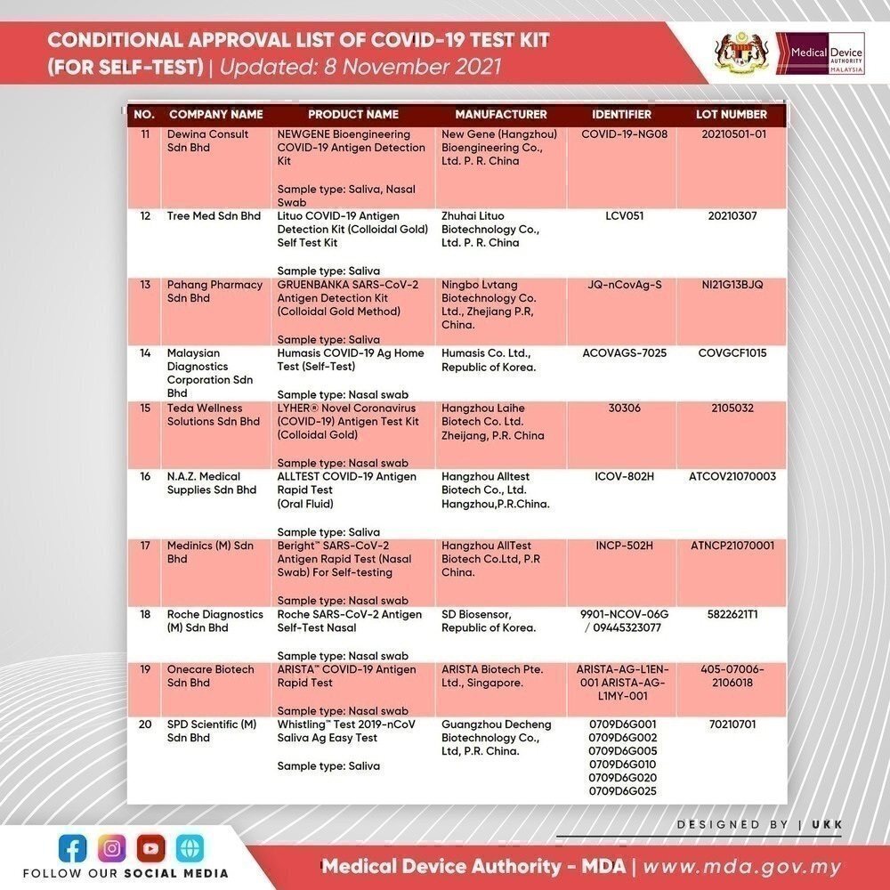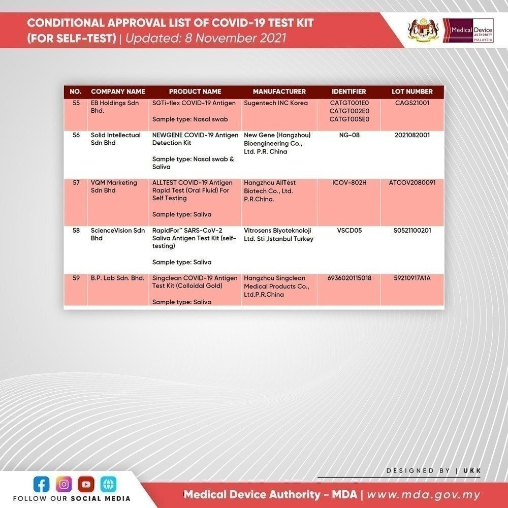 CONDITIONAL APPROVAL LIST OF COVID - 19 TEST KIT (FOR SELF TEST) - 8 NOV 2021
