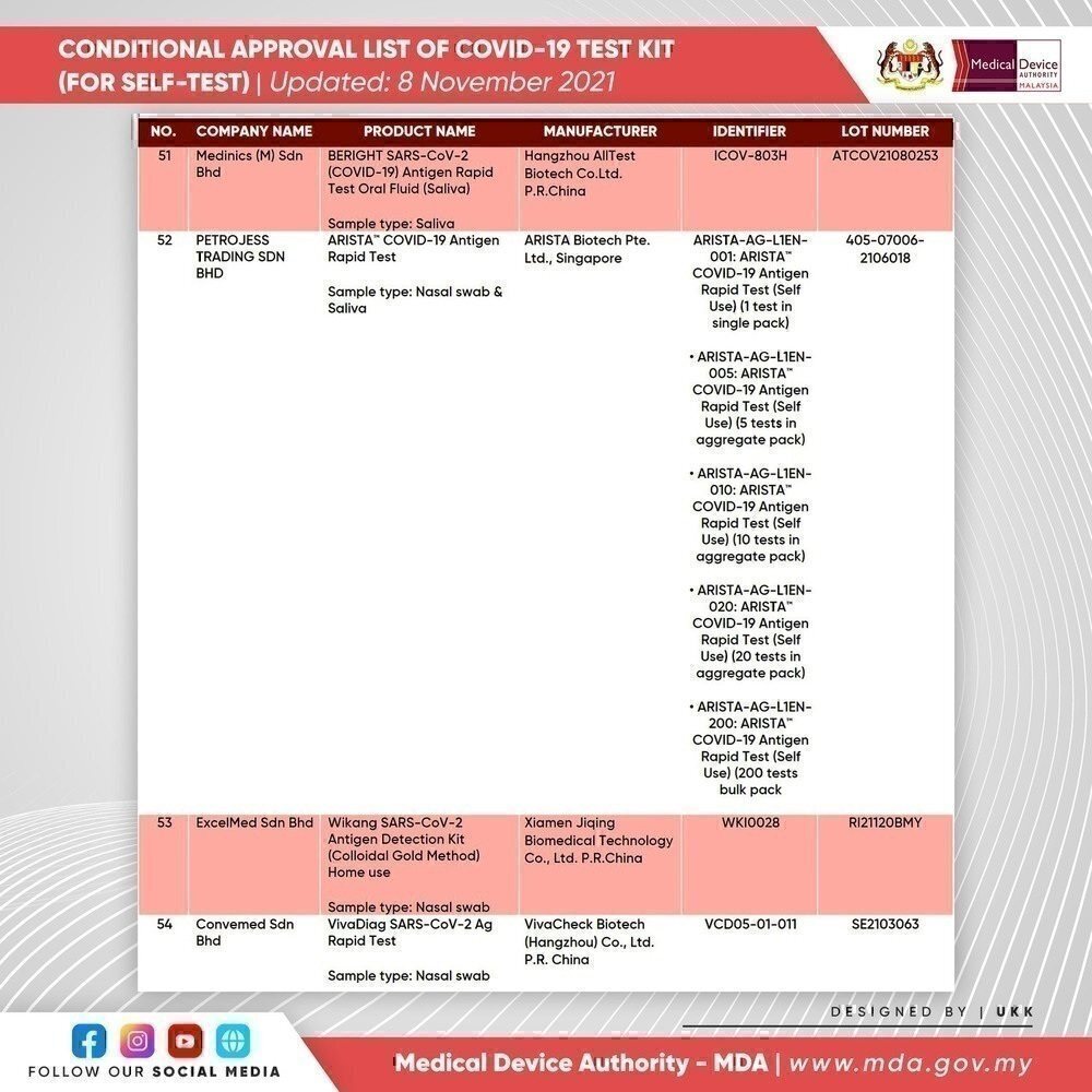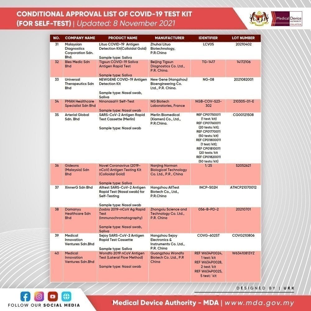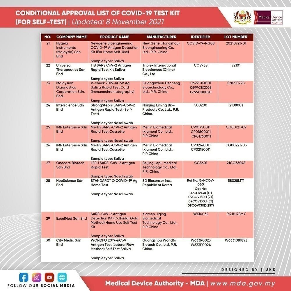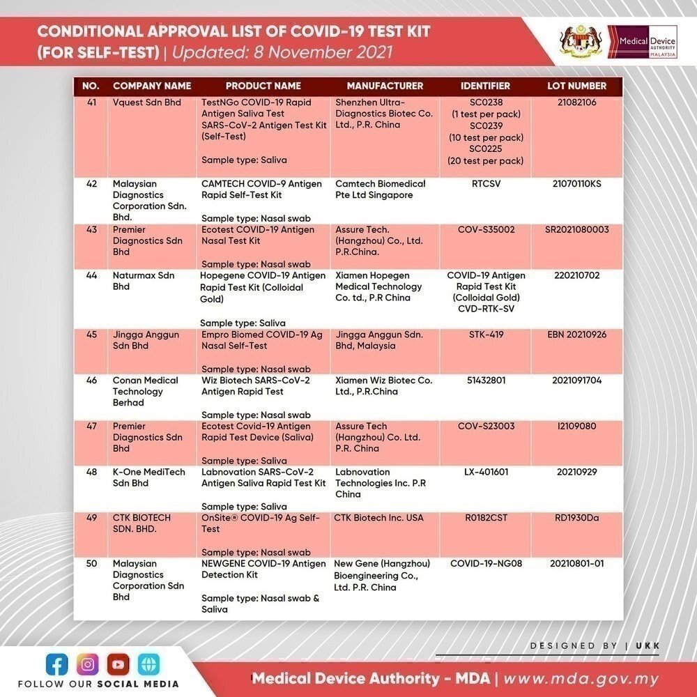 CONDITIONAL APPROVAL LIST OF COVID - 19 TEST KIT (FOR SELF TEST) - 8 NOV 2021