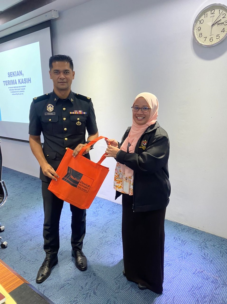 Sesi tersebut telah dihadiri oleh pegawai-pegawai MDA dan dipengerusikan oleh Pengarah Bahagian Pascapasaran dan Penguatkuasaan, Puan Idamazura binti Idris @ Harun. Penguat Kuasa KPDN yang diwakili oleh Tuan Mohd Redzuan bin Nordin dari Seksyen Serbuan dan Siasatan KPDN serta Tuan Mohd Shazuan bin Che Pin dari Seksyen Harta Intelek KPDN telah memberikan taklimat berkaitan dengan isu peranti perubatan palsu dan melepasi tarikh luput. Selain itu, turut dibincangkan adalah kerjasama penguatkuasaan di antara MDA dengan KPDN pada masa akan datang.-Muhammad Ikhwan Hafiz Bin Zainuddin, MDA
