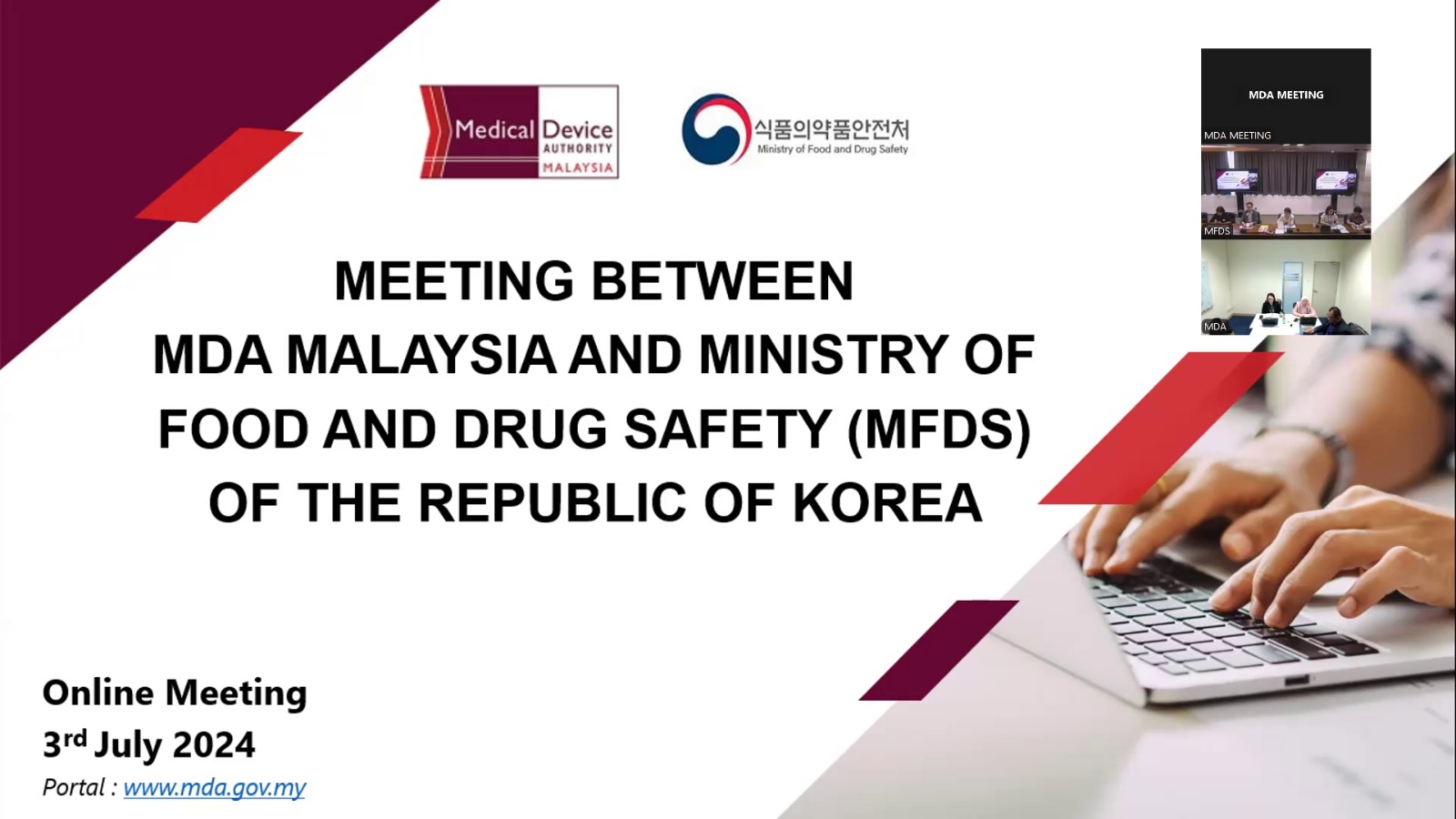 3 Julai 2024, Cyberjaya - Mesyuarat Dua Hala antara MDA, Malaysia dan ‘Ministry of Food and Drug Safety’ (MFDS), Korea Selatan telah diadakan secara dalam talian bagi membincangkan potensi kerjasama ke arah 'regulatory reliance' antara kedua-dua negara.
